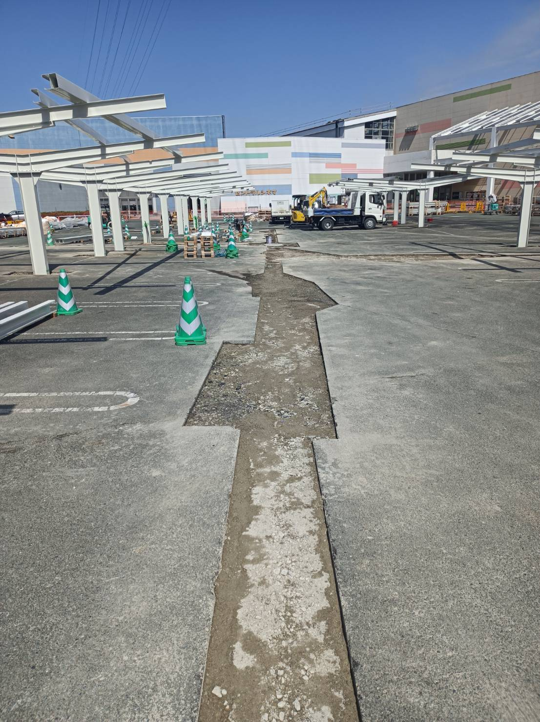 作業内容には、杭芯の掘削と配管埋設工事、そしてカーポートの施工が含まれています。